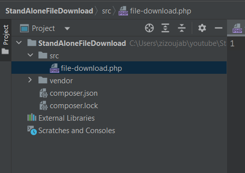 You simply need to create a folder let’s call it StandAloneFileDownload then within create an src folder and finally create a new php file, let’s name it weather.php so we should have this tree : StandAloneFileDownload > src > file-download.php